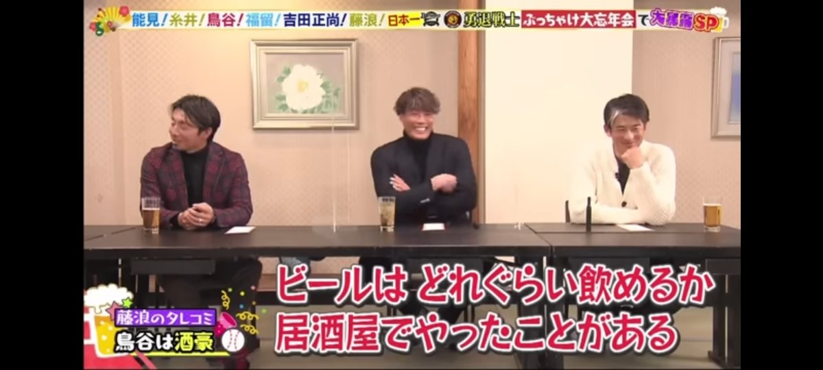 企画には元阪神の同僚でもある糸井嘉男氏、能見篤史氏も出演。3人の忘年会には同じく阪神からメジャー挑戦を目指す藤浪晋太郎投手がVTRで登場し、鳥谷氏の印象に「お酒を何度か、ご一緒させてもらいましたが、ひたすら飲んでも酔っぱらわない。で、次の日は(朝から)絶対にウエーとしている」と、酒豪ぶりを暴露。「めちゃくちゃお酒強い印象しかない」と語った。