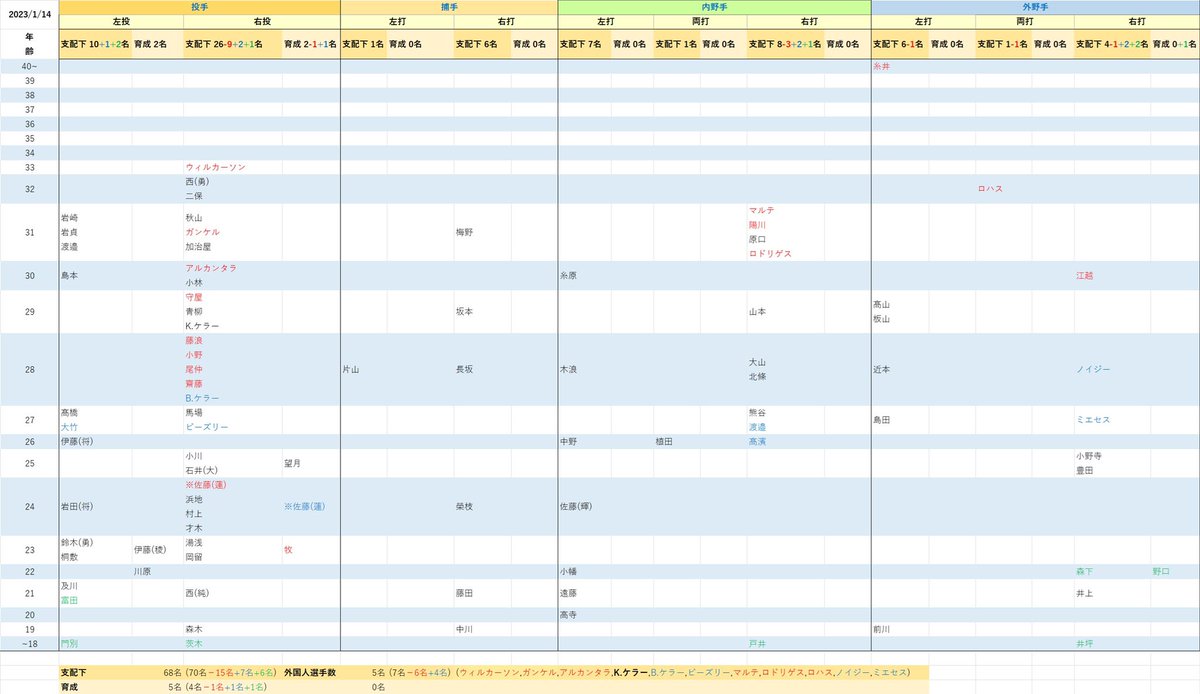 支配下:68名(うち外国人選手5名)