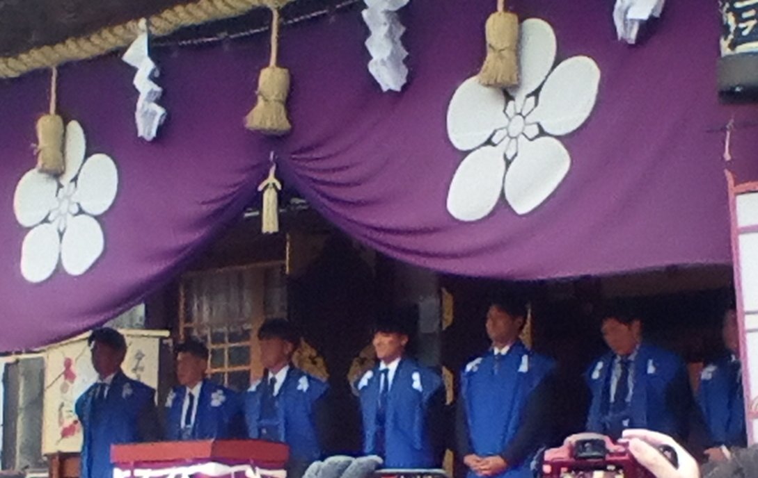 大阪天満宮の福玉行事に参加した(左から)中川、豊田、岡留、森木、前川、桐敷、鈴木