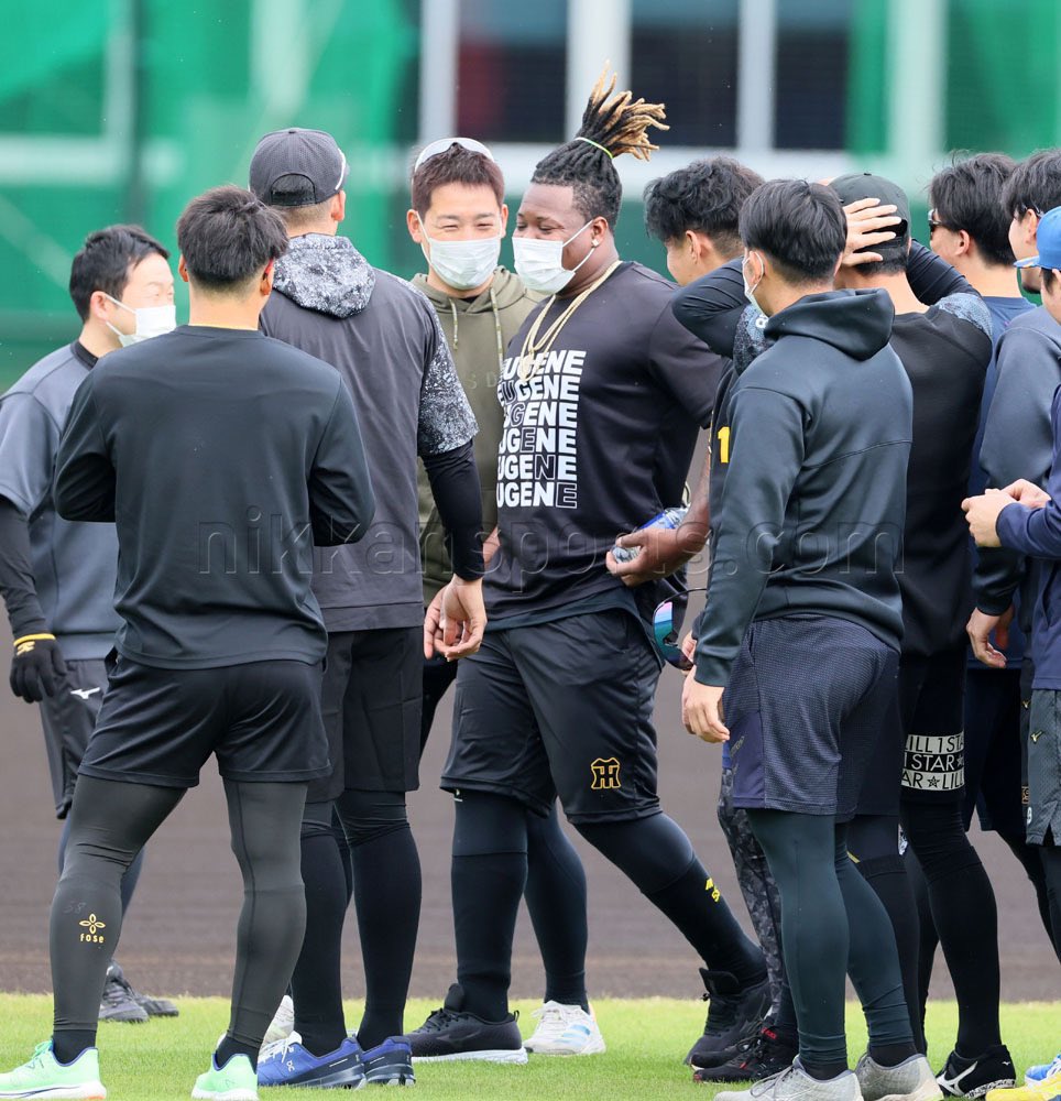 佐藤輝らとも会話をかわすなど、歓迎ムードの選手とともにリラックスした様子で練習に臨んだ。