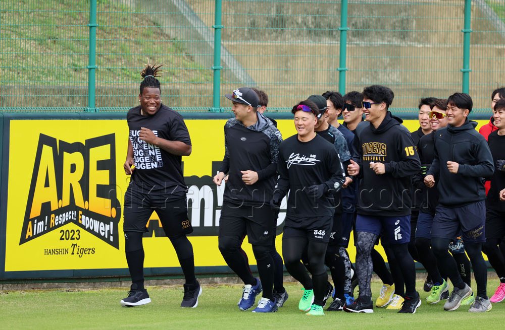 午前9時56分、グラウンドに姿を現すと、通訳を介し円陣の中でナインにあいさつ。その後、3列縦隊となって歩調を合わせる「連帯歩調」では岩崎に促され前川、井上とともに先頭へ。120キロの巨漢が笑顔で虎ナインを引っ張った。