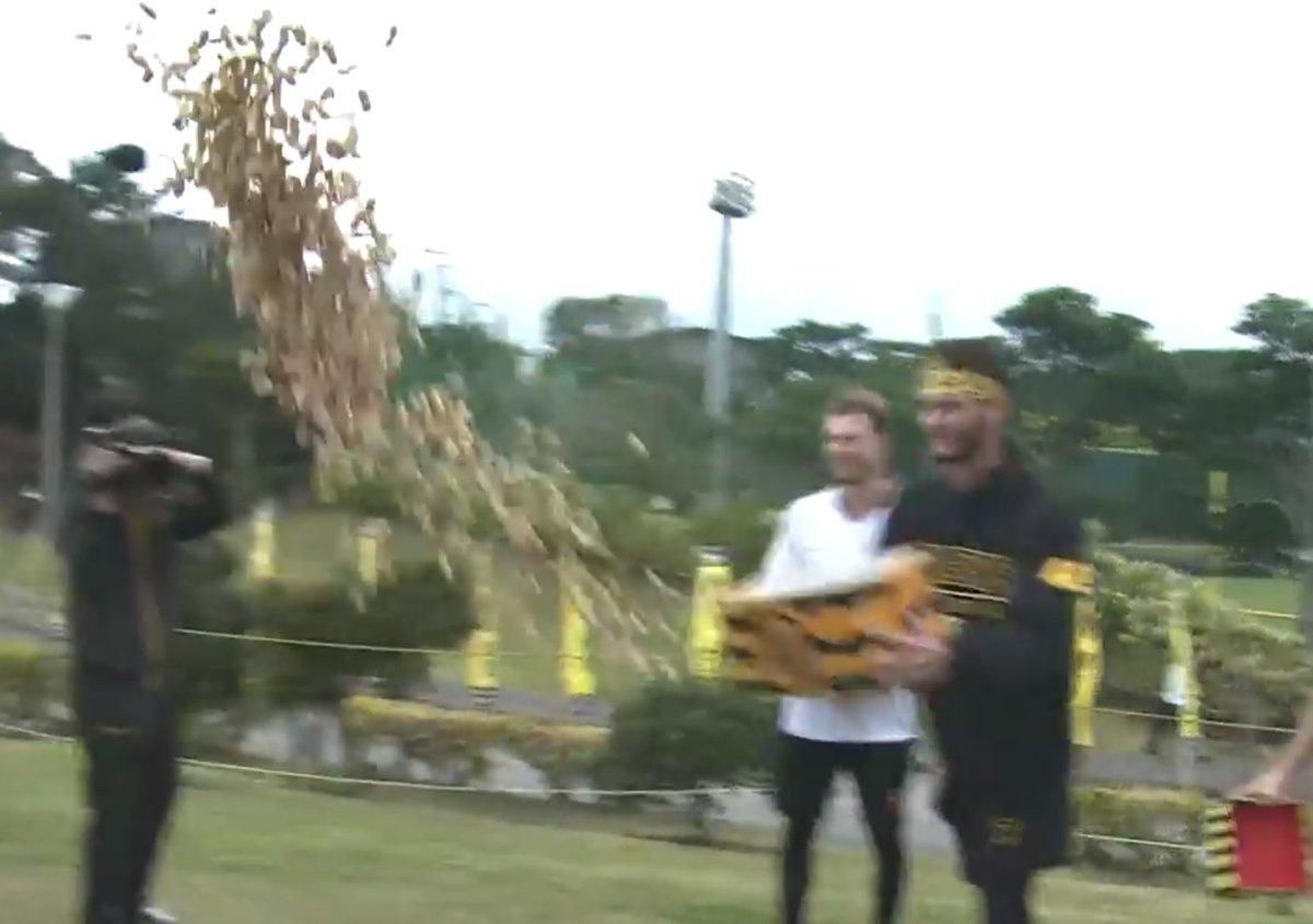 まずはシェルドン・ノイジー外野手(28)=前アスレチックス3A、ヨハン・ミエセス外野手(27)=前レッドソックス3A=の野手2人が赤鬼、青鬼らに力強く豆を投げつけ、「オニハソト~!!」と日本の文化になじんだ様子。ノイジーは「今までやったことがなく新鮮だった。自分に幸運が訪れるように願っています」と声を弾ませ、ミエセスは「日本の文化に触れられてよかった。皆さんにも幸運が来るように」と話した。