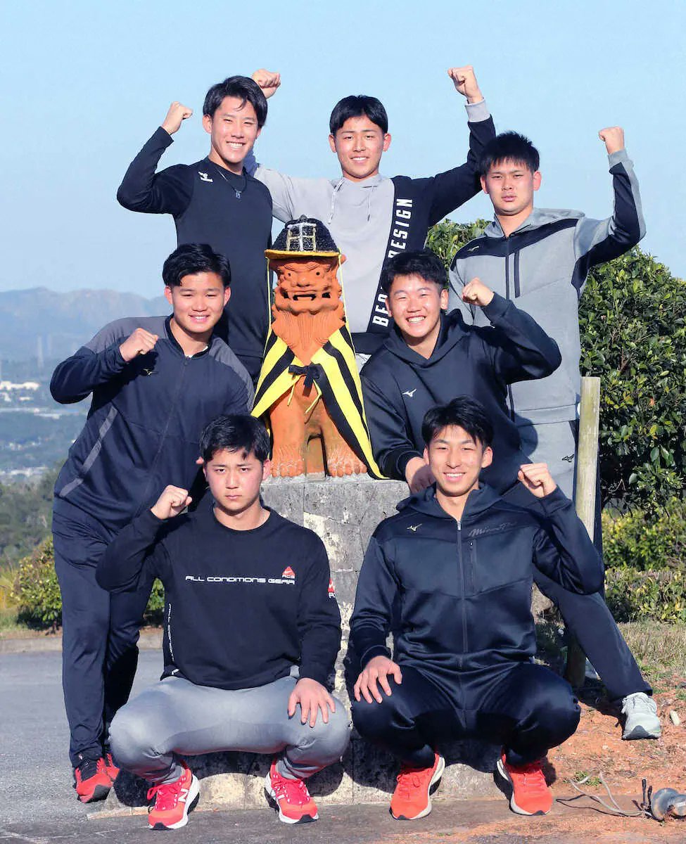 沖縄入りし、宿舎前でポーズを決める新人選手たち。(前列左から)井坪、茨木、(中列左から)森下、門別、(後列左から)富田、戸井、野口(撮影・成瀬 徹)