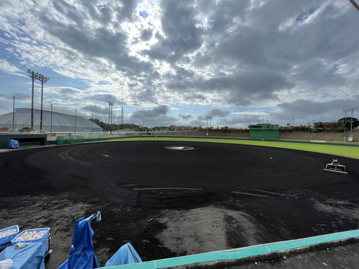 宜野座ドームは異例のウオーミング前にシャッターが閉められ、報道陣の視界をシャットアウト。サインプレーの確認が行われている模様だ。