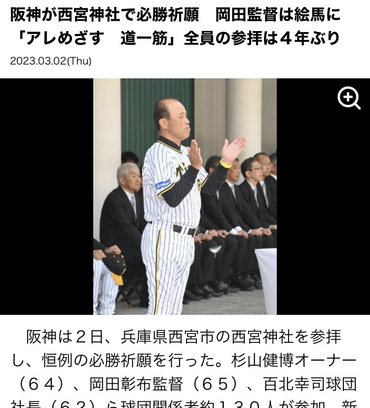 〇…22年12月に就任した阪神杉山健博オーナー(64)は西宮神社の必勝祈願に初参加した。「商売繁盛のベースは、ひとえに18年ぶりのリーグ優勝。これまで以上にチームとフロントが一丸となってやっていきますと祈るんじゃなくてお伝えした」と話した。沖縄・宜野座キャンプを計4度視察し「全体にピーンと張り詰めた空気があった。練習の効果、成果が出る一番のポイントは適度な緊張感。非常に実りあるすばらしいキャンプだった」と評価。今後も可能な限り甲子園などに足を運ぶ。