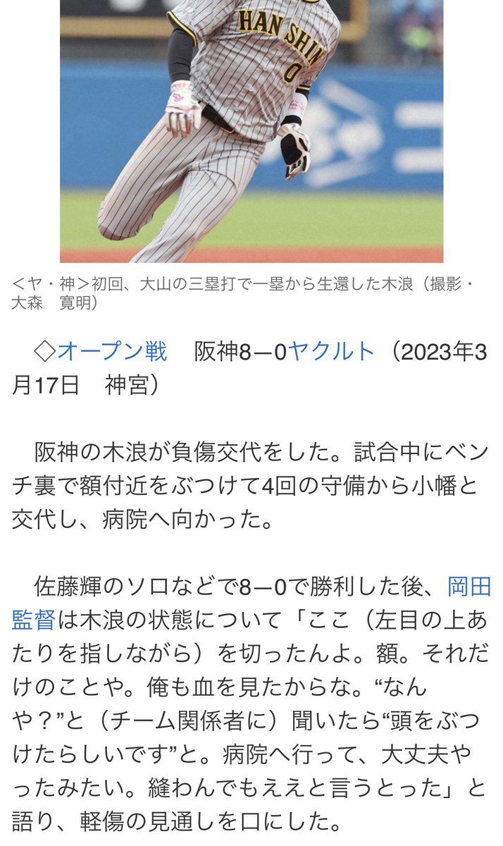 佐藤輝のソロなどで8―0で勝利した後、岡田監督は木浪の状態について「ここ(左目の上あたりを指しながら)を切ったんよ。額。それだけのことや。俺も血を見たからな。“なんや?”と(チーム関係者に)聞いたら“頭をぶつけたらしいです”と。病院へ行って、大丈夫やったみたい。縫わんでもええと言うとった」と語り、軽傷の見通しを口にした。