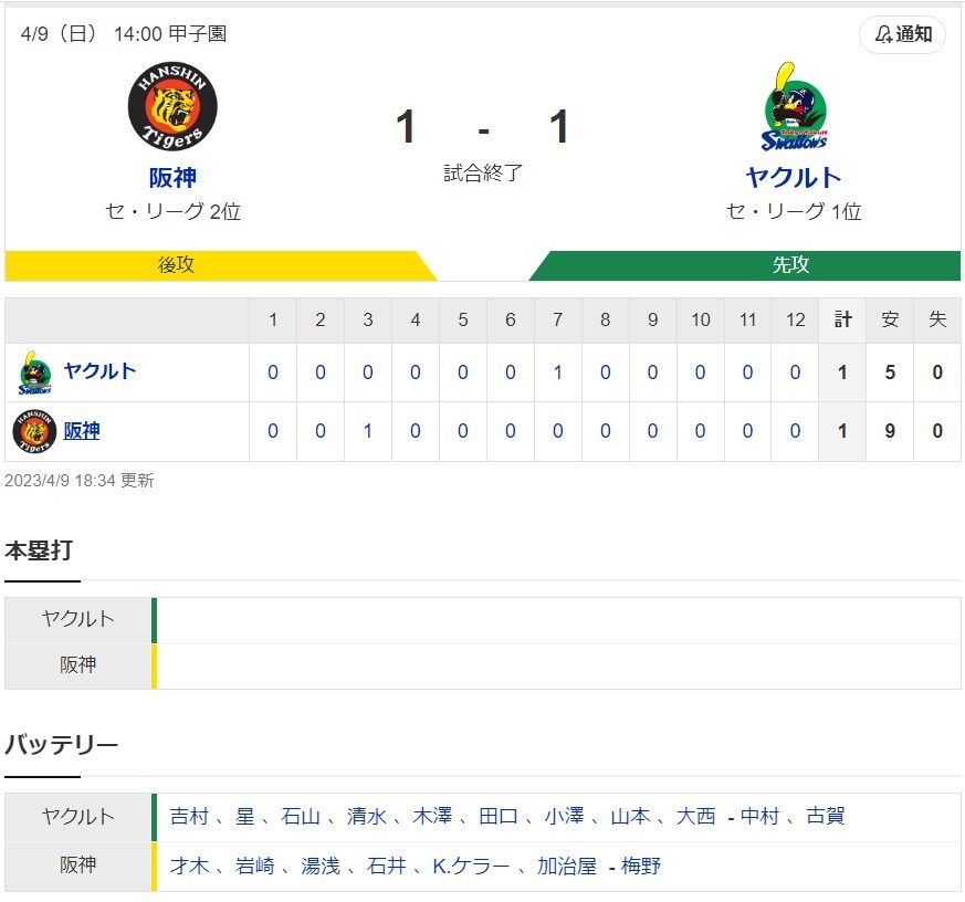 【一軍】阪神1-1ヤクルト