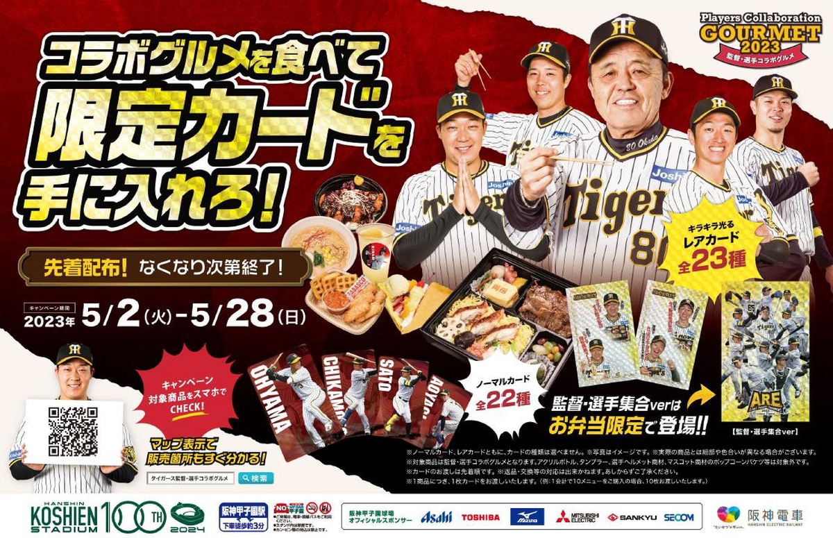 阪神電鉄は28日、阪神甲子園球場で行われる5月2日の中日戦から同28日の巨人戦において、球場内売店・ワゴンおよび外周お弁当ワゴンで「監督・選手コラボグルメ」を購入した際に、阪神タイガースの監督・選手がデザインされた「限定カード」をプレゼントするキャンペーンを実施すると発表した。