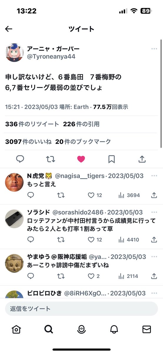 @hanshintigersjp ミエセススタメン外すのはいいけど島田か…