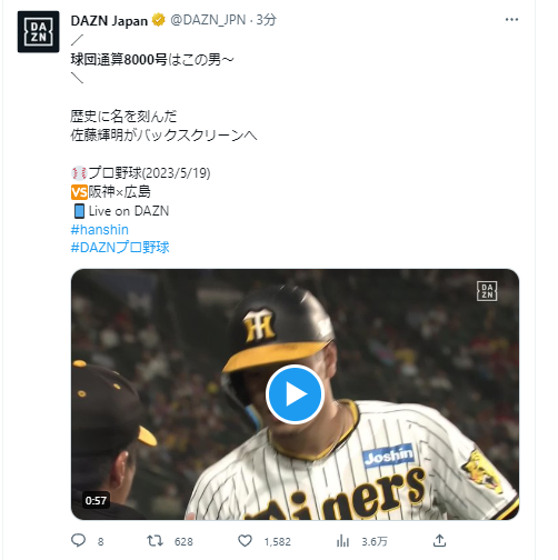背番号8番の今季8号ホームランが阪神球団通算8000号ホームラン https://twitter.com/dazn_jpn/status/1659504225406316545 …