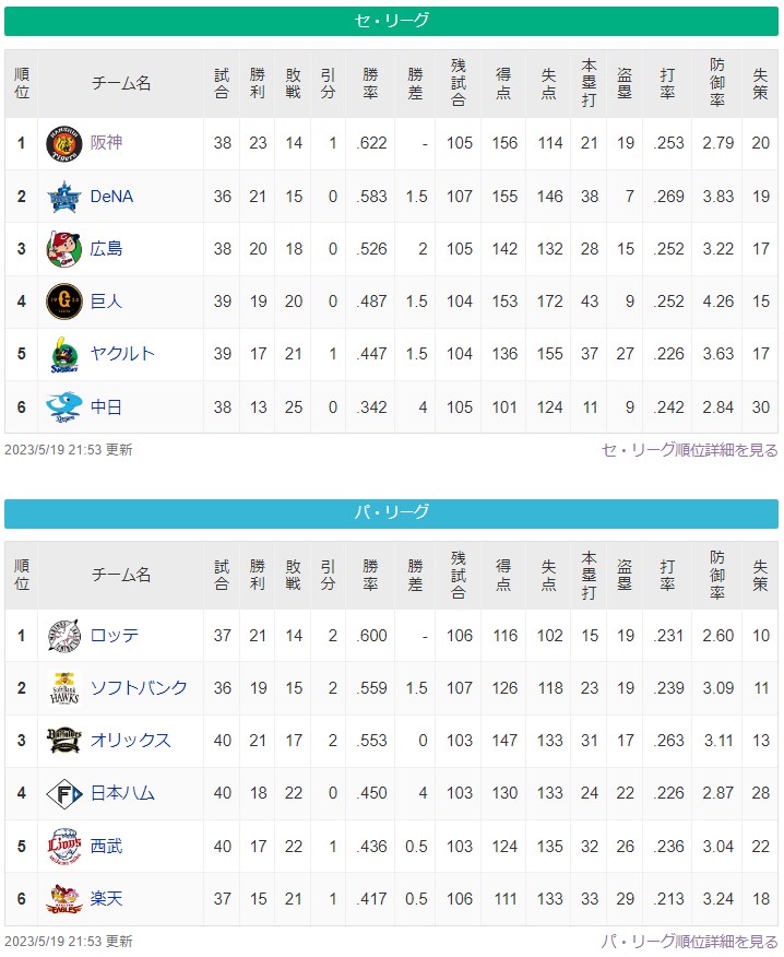 阪神 現在+09 最多貯金10(05/18) 最多借金*0(--/--)