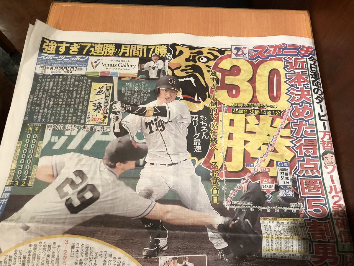 <阪神3-2巨人>◇27日◇甲子園阪神が7連勝で両リーグ30勝一番乗り。阪神にとって開幕45試合目で30勝到達は37年秋の36試合目、39年春の39試合目、47年の43試合目に次ぎ、03年に並び4番目のスピード。両リーグ30勝一番乗りは03、21年に次いで3度目になる。これで阪神は11日から7連勝→●→7連勝。月間2度の7連勝以上は16年5月のソフトバンク(8連勝を2度)以来だが、セ・リーグでは68年8月の阪神以来、55年ぶり2度目。68年阪神は7日から7連勝→●→9連勝と、18日中日戦の黒星を挟み17試合で16勝した。