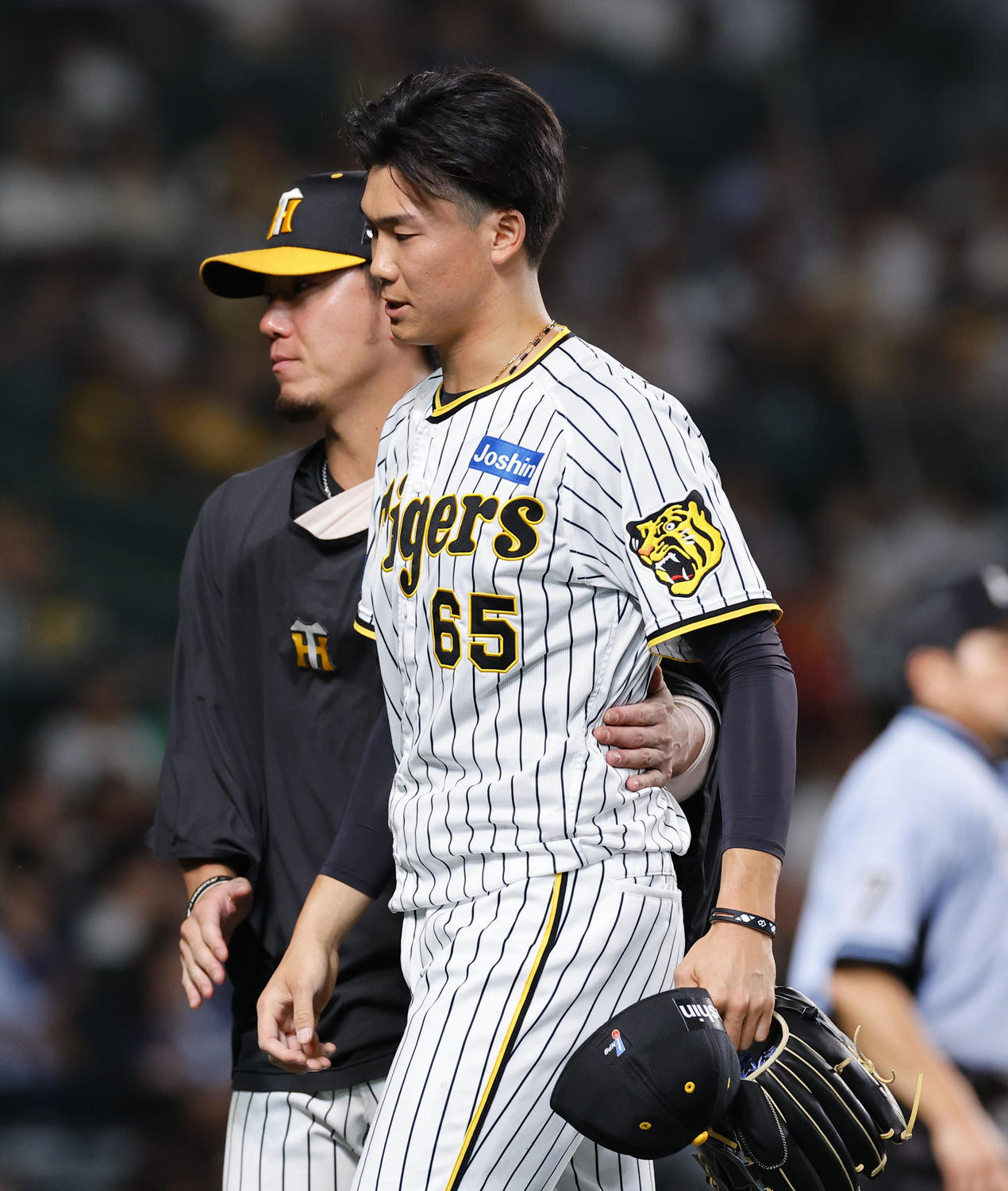 <日本生命セ・パ交流戦:阪神2-3オリックス>◇15日◇甲子園また悪夢…。9回に3番手で登板した阪神湯浅京己投手(23)が、痛恨の2被弾で逆転を許した。岡田監督は試合後、「もう投げさせられへん」と2軍降格を示唆した。1点リードの9回1死、オリックス4番の頓宮にソロアーチを浴びた。さらに2死から6番杉本にもソロを浴び、勝ち越しを許し、ここで降板した。湯浅の1試合2被弾はプロ初だ。チームはそのまま敗戦。湯浅は今季2敗目となった。試合後には「制球とかの問題じゃない。ボールに力がない」と唇をかんだ。湯浅は、8日の楽天戦(楽天モバイルパーク)で9回にサヨナラ3ランを浴びていた。11日の日本ハム戦(エスコンフィールド)は1回無失点でセーブを挙げていたが、2試合ぶりに痛いアーチを浴びた。昨季59試合で被本塁打わずか1の守護神が、今季早くも3本目の被弾となった。これで先発伊藤将司投手(27)の甲子園12連勝は消滅した。