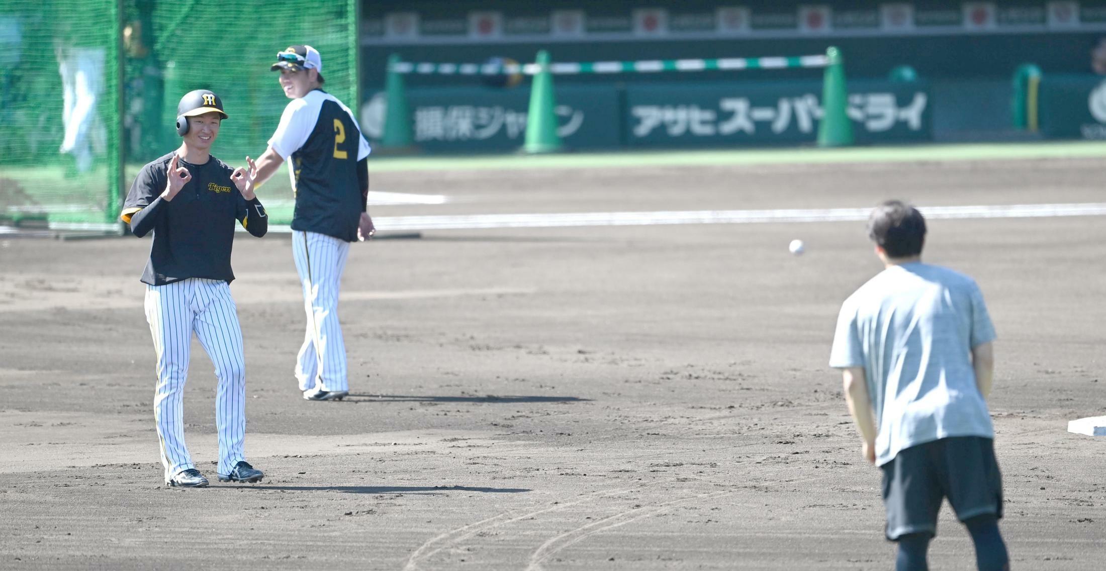 「阪神タイガース-読売ジャイアンツ」(25日、甲子園球場)阪神の試合前練習中に巨人の高梨雄平投手が岡田監督のもとを訪れ、言葉をかわした。さらに走塁練習中だった近本光司外野手とも言葉を交わし、近本は左腕を気遣うジャスチャーを見せた。近本は7月2日・巨人戦(東京ドーム)の七回に左腕・高梨から右脇腹付近に死球を受けてもん絶。直後、七回の守備では美技を見せるなど延長十二回までフル出場したが、試合後は「(死球は)関係ないので、自分のやることをやるだけ」と話すにとどめていた。だが精密検査の結果、右肋骨の骨折と診断され、出場選手登録を抹消された。高梨はその後、阪神の糸原を通じて謝罪していたが、顔を合わせて言葉をかわすことで“わだかまり”を解消したかったとみられる。近本は歩み寄る左腕に笑みを浮かべながら、来なくて大丈夫だよーとジェスチャーを送る場面もあった。