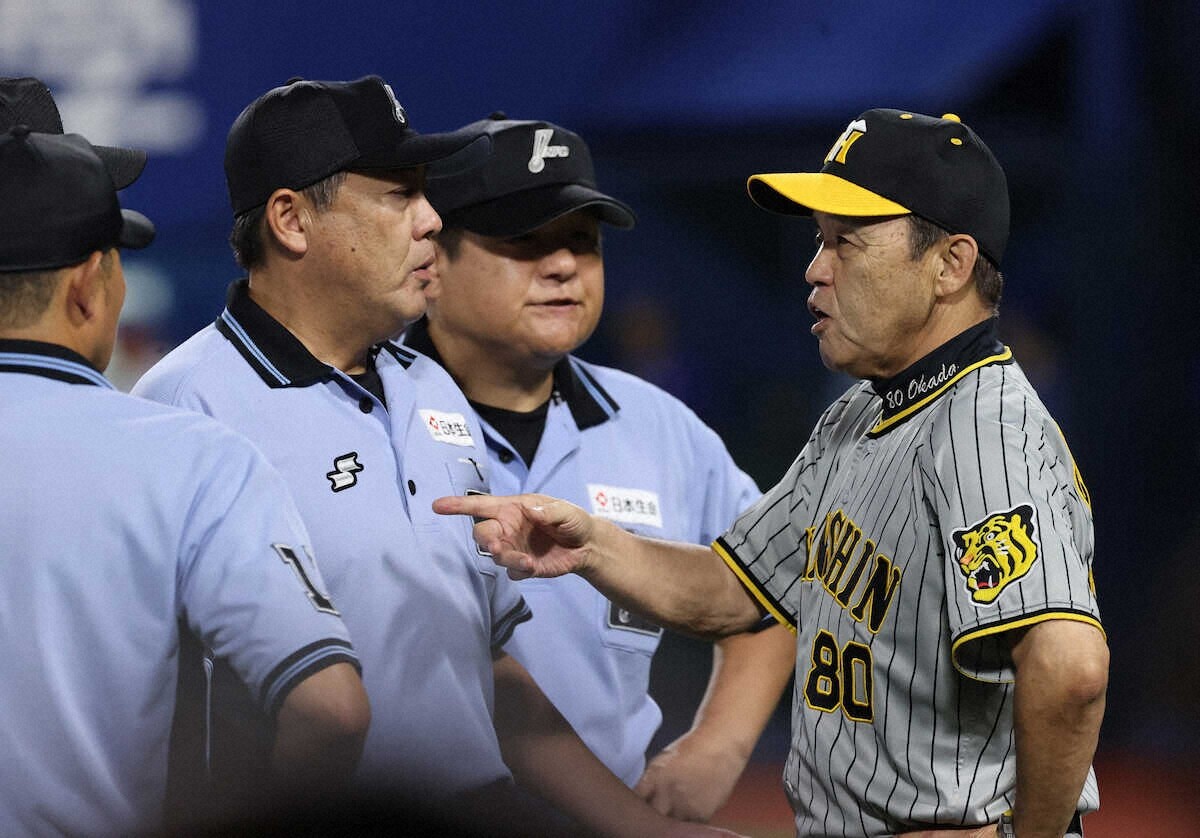 阪神の嶌村球団本部長が19日、18日DeNA戦で起きた二盗を巡る判定について、日本野球機構(NPB)に意見書を提出したことを明かした。岡田監督は球場入りする際に「(意見書は?)もう出したやろ」、判定についての見解を聞かれると「知らんがな」とだけ残して球場入りした。前夜の怒りがまだ収まっていない様子だった。問題のプレーは、9回1死一塁で起きた。二盗を試みた熊谷は、一塁側にそれた送球を取ろうとした遊撃・京田と真正面から激突。一度はセーフと判定されたものの、DeNAのリクエストによってアウトに覆った。映像での確認により、京田がベースをふさいだことによって、熊谷はベースに触れることができなかったためにアウトとされた。岡田監督は「走塁妨害」と主張し、責任審判の敷田審判は「偶然ああいう形になった。ベースに届いてないのでアウトにした。走塁妨害とは見ていない。故意でフェア(プレー)でないなら考えるが、精一杯のプレーの結果だった」と語った。岡田監督は5分半に及ぶ抗議をした。同点のチャンスが消えたチームは1点差で敗れた。
