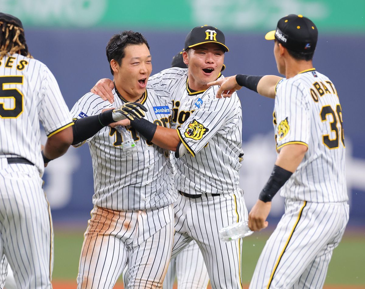さすが4番! 死闘制した! 阪神は中日に4-3で今季8度目のサヨナラ勝ち。延長十回2死満塁で大山悠輔内野手(28)が左前にはじき返し、3連勝を決めた。貯金は今季最多の25で、優勝マジックは25。京セラドームは今季7戦全勝。長いシーズン、山あり谷あり。18年ぶりの栄冠を目指す虎に大山あり!不気味なほど、落ち着いていた。このチームにおける役割を分かっていた。ひと振りで決めた。白球が左翼に弾む。大山は一塁を回ると両手を突き上げた。仲間たちが駆け寄る。4時間25分にピリオドを打った。ウオーターシャワーを浴びた主砲は心の底から笑った。「めちゃくちゃ気持ちいいです! ヒットだなと思ったので、勝ったな、と。そこで一安心しました」延長十回、野球の格言を体現するかのような2死からのドラマを完成させた。近本が中前に運ぶと、中野、森下は冷静に四球を選んだ。岡田監督は選手の雰囲気について「ボールを選んだときが一番喜んでいる」という。今季のチーム四球数390はセ・リーグトップ。15年ぶりに現場復帰した将の教えが浸透し、ヒットと同じように狙ってもぎとるようになった。リレーのバトンのようにつなぐ。それをかえすのが4番の仕事。大山のハラは据わっていた。「投手陣が必死に抑えてくれましたし、前のバッターが必死になってつないでくれたので、しっかり決めるべきだと思って打席に入りました」ボール球には反応せず、田島の甘く入った球を見逃さなかった。4球目の真ん中に入ったスプリットを左前へ。2021年9月4日の巨人戦(甲子園=本塁打)以来、2年ぶりのサヨナラ打。次々打者だった佐藤輝が「絶対決めてくれると思ってみていました」というほど、誰もが勝利を確信していた。独走する今季を象徴するかのような戦い方だっだ。今年で7年目。2009年の金本知憲以来、球団5人目の全試合4番出場へ突き進んでいる。前回優勝の05年に5番打者として球団最多のシーズン147打点を挙げた今岡打撃コーチは大山が完成期に入っているのではなく、伸びしろが十分あると断言する。「まだまだじゃない? もっといい選手になる」。どんな状況でも下を向かない。勝利のために全力プレーを心がける。4番で2度のリーグ優勝に導いた金本に通ずるものがある。「最終的にどんな形であれ、勝つことが大事なので、そういう意味では勝てていることが一番いい。目の前の一試合をチーム一丸となって戦っていくだけ」3連勝のヒーローインタビューを終えた大山は表情を引き締めた。マジックも1つ減らして25とした。2位広島も負けない。ならば、阪神は勝てばいい。アレに向かって突き進む虎を〝夏の大山〟が、さらに上へと押し上げる。(織原祥平)■データBOX◉…阪神は今季8度目のサヨナラ勝ち。12日のヤクルト戦(京セラ)以来。今季延長戦では7勝3敗4分け。先制を許すと19勝30敗1分け◉…大山のサヨナラ打は2021年9月4日の巨人戦(甲子園=本塁打)以来、2年ぶり6度目◉…岡田監督は阪神監督通算459勝(348敗、22分け)とし、歴代3位の松木謙次郎にあと1勝とした。1位は藤本定義の514勝(424敗、24分け)