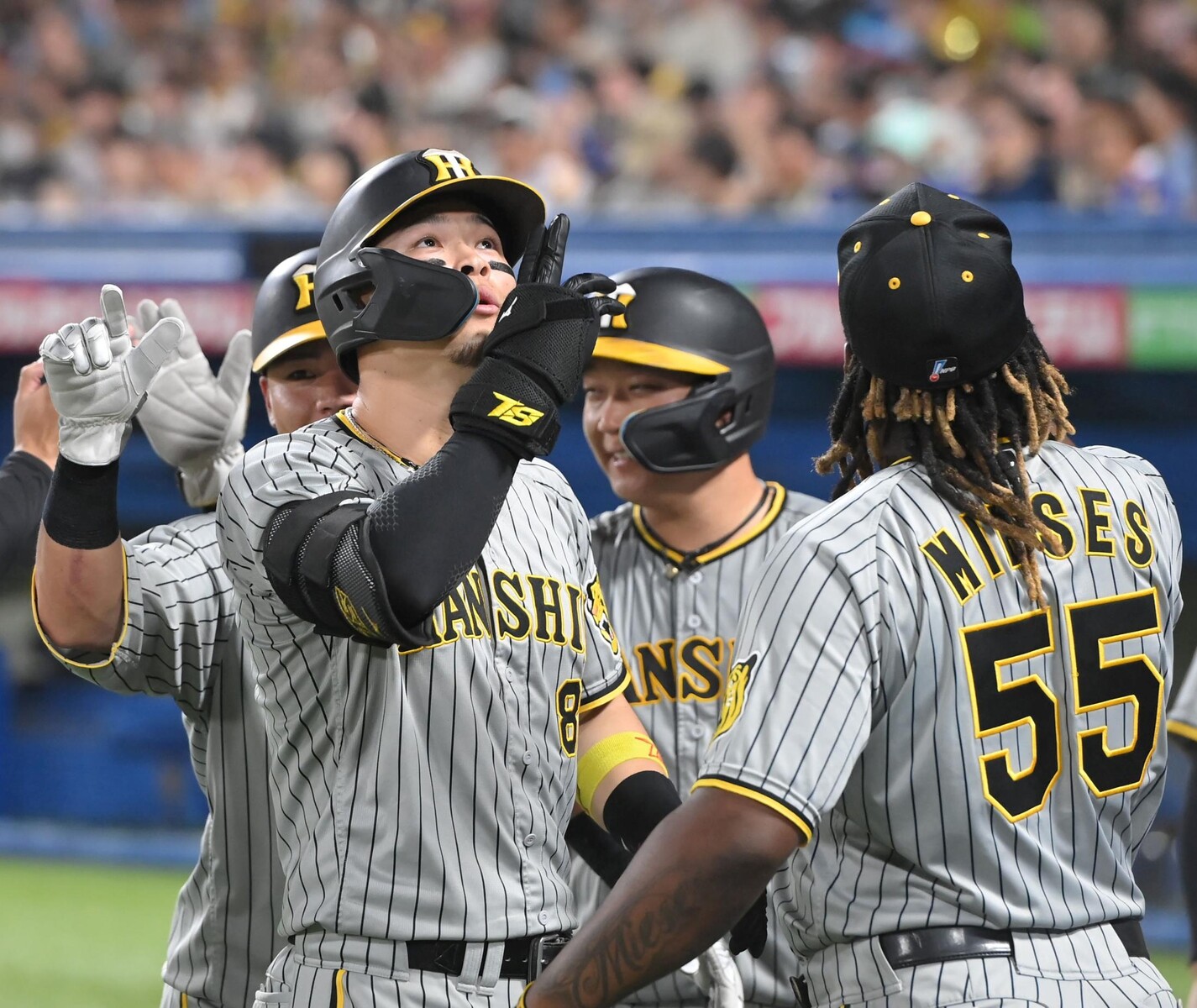 「東京ヤクルトスワローズ5-6阪神タイガース」(2日、神宮球場)阪神・佐藤輝明内野手が小野寺の2点適時三塁打で逆転に成功した三回2死一、三塁から右翼席に16号3ランを運び、一挙6得点の猛攻を締めた。ヒーローインタビュー臨んだ佐藤輝は「点を取っていい流れだったので、その勢いのままに強いスイングをしようと思いました」と本塁打の場面を振り返った。続けて「最初はファウルかなと思ったんですけど、結果ホームランになって良かったです」と語ると、左翼席の阪神ファンはメガホンを叩いて喜んだ。前日1日は自身がアイブラックを書き込んだ森下がプロ入り初の1試合2本塁打を放ち、この日は自身が勝利を呼び込む16号3ランと“アイブラックコンビ”で連勝を呼び込んだ。それでも佐藤輝は「でもアイツ今日打てなかったんで、明日どうするかはこのあと考えます」と話すと、スタンドは大きな笑いに包まれていた。