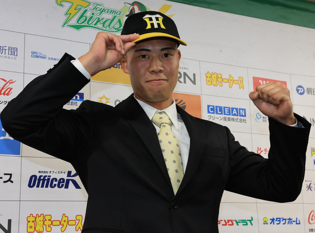 「プロ野球ドラフト会議 supported by リポビタンD」(24日、都内ホテル)阪神はドラフト5位で独立リーグ・富山の佐野大陽内野手(22)を指名した。常葉大橘出身で、中部大を経て、独立リーグで技術を磨き、プロ入りをつかんだ。担当は筒井スカウトで、球団は「柔らかいグラブ捌きで堅実な守備が持ち味の内野手。捕球からスローイングまでの無駄がなく安定感がある。打撃面でレベルアップを図ることができれば、将来的にチームの中心選手として期待される選手」と評した。常葉大橘は高橋遥人投手の出身校で、先輩にあたる。さらに湯浅、松原も富山の先輩だ。指名された直後には涙を流し、「先輩方の後ろを1日でも早く守れるように」と語った佐野。富山から野手が支配下で指名されるのは初の快挙だった
