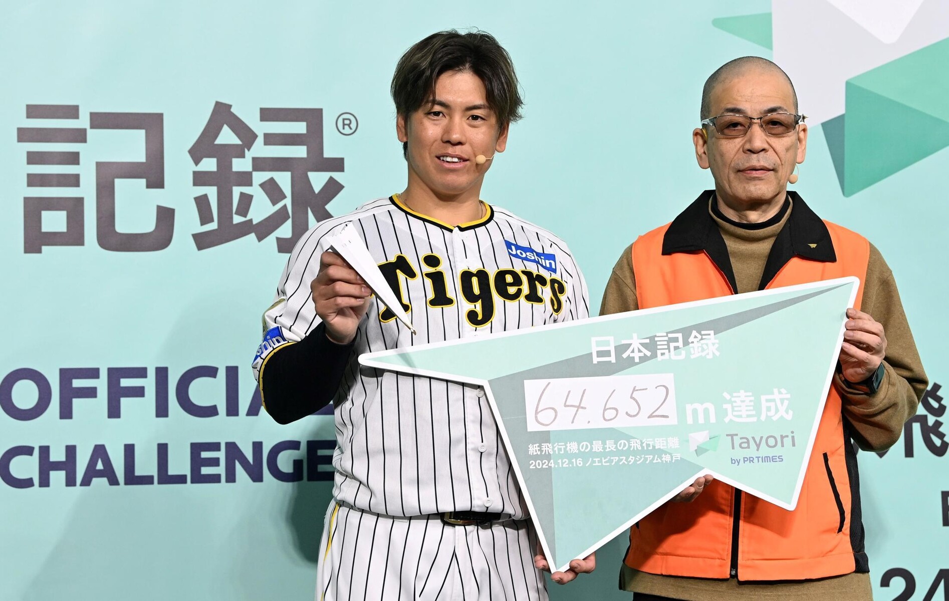 阪神の梅野隆太郎捕手(33)が16日、ノエビアスタジアム神戸で行われた「Tayoriが紙飛行機でギネス世界記録に挑戦!」に参加し、紙飛行機の飛距離で日本記録を更新した。3投目でこれまでの日本最長記録である61・82メートルを更新する64・652メートルを記録。合計44回、紙飛行機を飛ばしたが、世界記録の88・318メートルを更新することはできなかった。梅野は2019年に、NPB捕手新記録となるシーズン123補殺を達成。1954年に土井垣武(東映)が記録した119補殺を、65年ぶりに更新する日本記録を持っている。