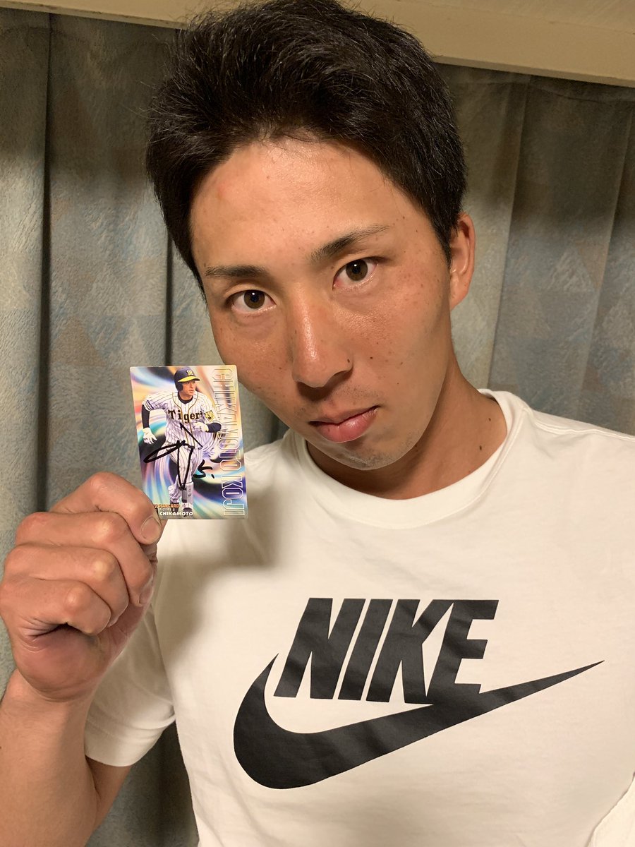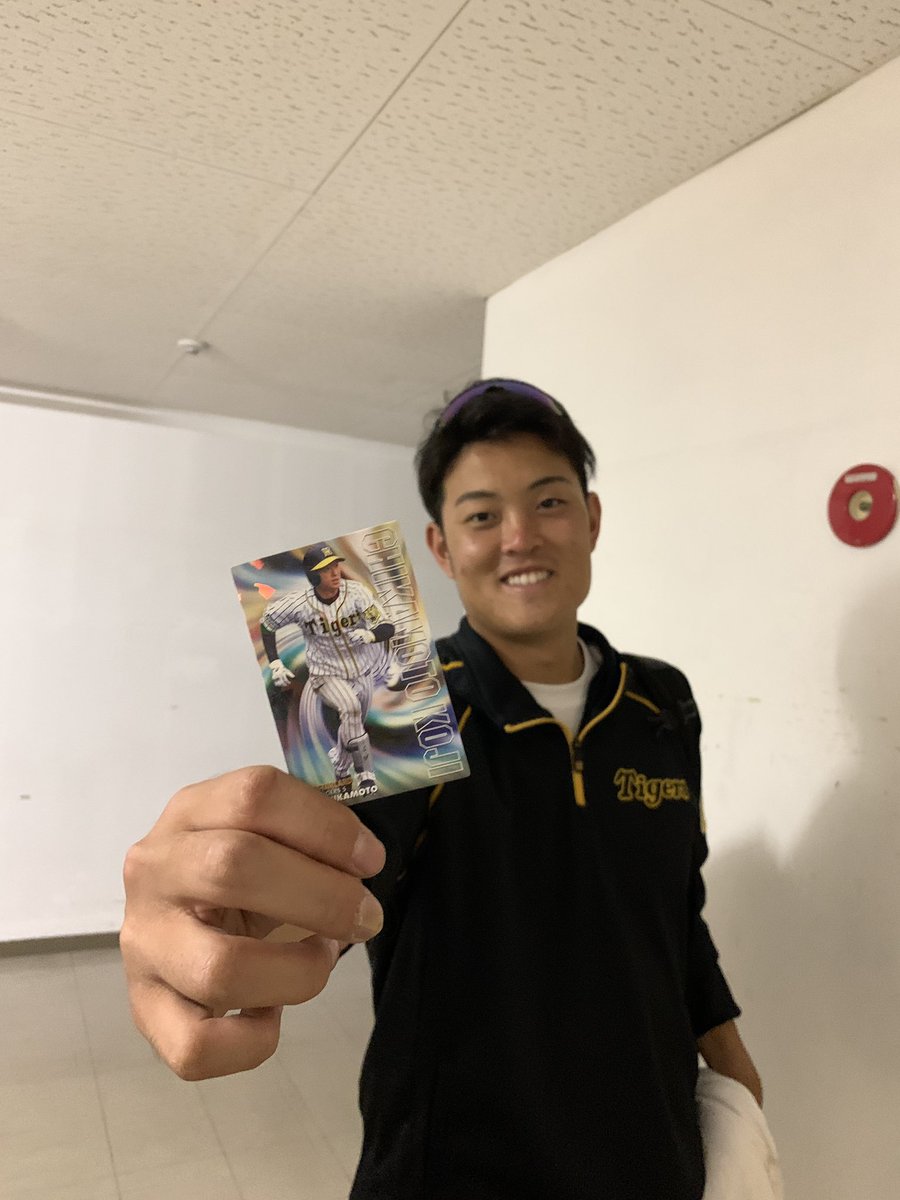 望月がファンから頂いたプロ野球チップスの付録カードが、僕だったので、サインを書いて近本ファンの片山君にプレゼントしました😆