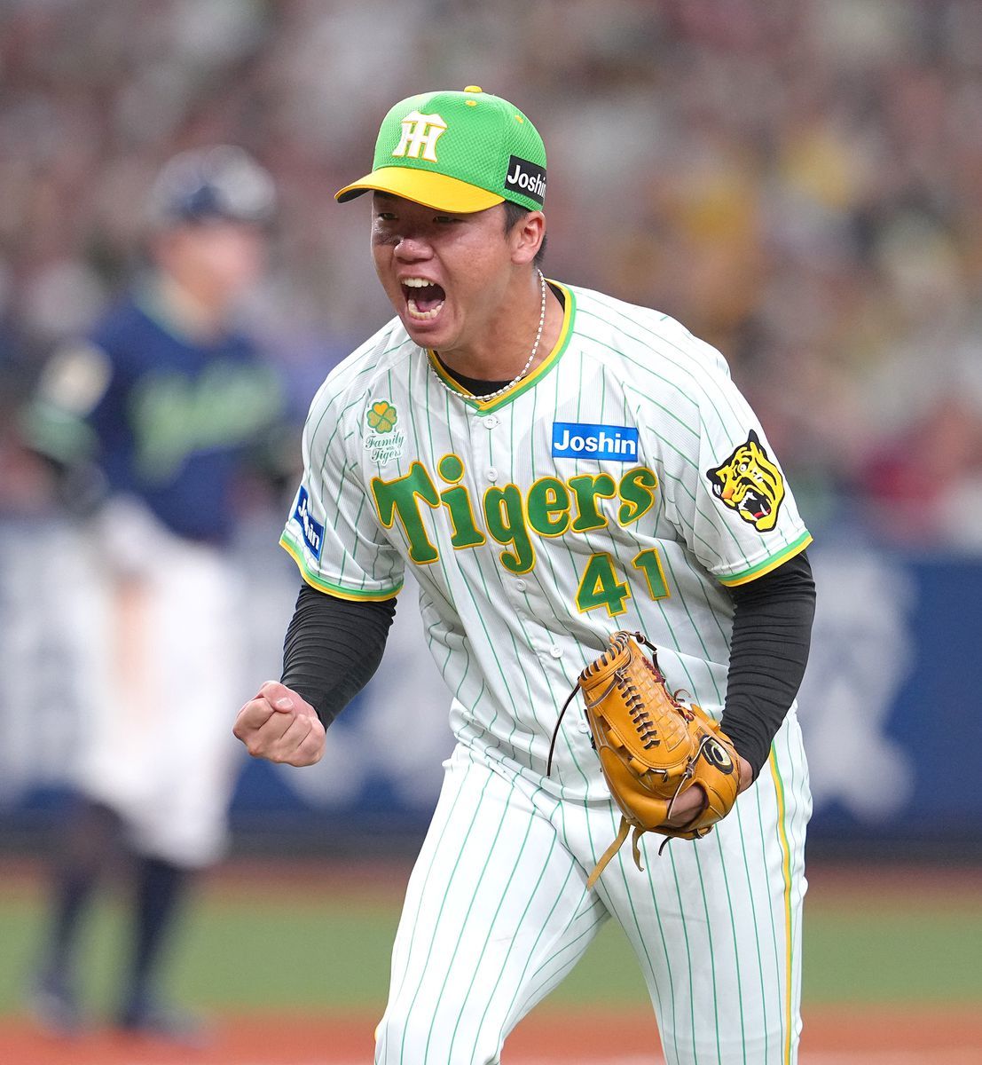 (セ・リーグ、阪神2-1ヤクルト、17回戦、阪神10勝6敗1分、11日、京セラ)左手がグラブの中にあっても、両拳を力強く握ったのが分かった。渾身(こんしん)のガッツポーズ-。村上が七回の最大のピンチを断ち、7回1失点の力投で、勝利への道を切り開いた。「チームが負けなかったというのが一番。それがよかった」力強い真っすぐを軸にし、三回までをパーフェクト。四回こそ先頭の塩見に中堅左へ同点ソロをたたき込まれたが、五、六回はゼロを並べた。そして1-1で迎えた七回。先頭・村上の中前打、さらに2四球で1死満塁を背負った。相手が切ったのは代打・川端のカード。ただ、村上はここでも逃げなかった。カウント1―2から4球目に投じたのは、四回に一度マークしていた、自己最速を1キロ更新する151キロ。この直球で押し込んで三ゴロ併殺と、最高の結果を導いた。「四球を連発してしまったので、もうちょっと攻められればとは思ったが、無失点で抑えられたのでよかった」スタンドが大喝采。村上も達成感を爆発させるように雄たけびをあげた。これで7試合連続クオリティスタート(先発で6回以上、自責点3以内)を達成。規定投球回にも再到達し、防御率は2・02で、セ・リーグのトップに浮上した。「(捕手の坂本)誠志郎さんが引っ張っていろいろと引き出してくれますし、野手が守ってくれて無失点とかクオリティ(スタート)になっている。そこは助けられながらという感じ」仲間への感謝を忘れなかった。手にできなかった白星はこれからも快投を続け、積み重ねていく。(須藤佳裕)